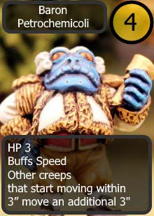 These feel like the perfect rank-and-file creeps for us to defend against. The fact that they have weapons themselves doesn't matter because they are only running and won't be using them. However you could add the 'stun' ability to them if you wish the get some use out of their weapons. Baron Petrochemicoli on the other hand Seems like more of a boss character. I imagine he would have some aura buffing abilities for his underlings as well as increased health.